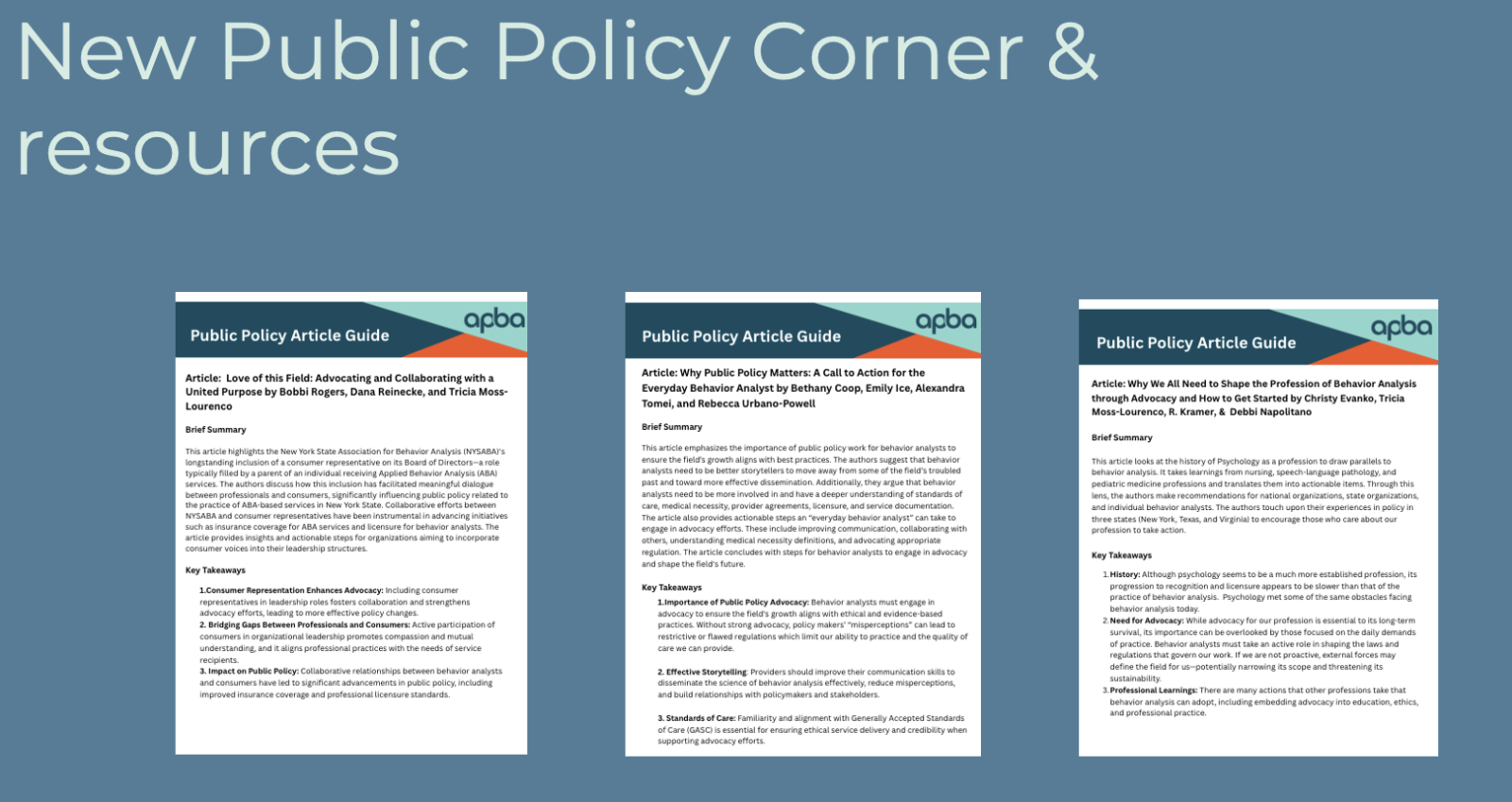 The APBA Public Policy Corner is your hub for staying informed, empowered, and engaged in the evolving landscape of ABA practice. Here, practitioners, organizations, and stakeholders can access timely updates, practical resources, and clear guidance developed by APBA’s Public Policy Committee to help navigate regulatory changes, funding challenges, and advocacy opportunities. Our goal is to support you in delivering high-quality, ethical services while strengthening the future of the profession.