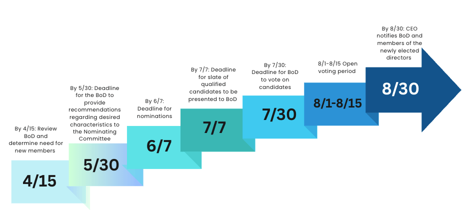 When a slate of candidates has been approved by the Board, the Chief Executive Officer shall arrange for an election by voting members. The election shall be conducted via electronic means. Voting members shall be instructed to vote for one candidate for each seat. The candidate(s) who receive(s) a majority of votes shall be elected to the Board. The election shall be completed by August 15.